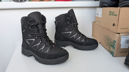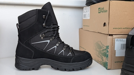 Jack Wolfskin Traction 3 Зимние ботинки (до -15С), остальное зависит от носков, верх шероховатая кожа, нейлон, мембрана, размер US 11 (немного маломерит, длина стельки 29.1 см, подойдут тем кто носит кроссовки Us 10/10.5). Цена: 8200 руб